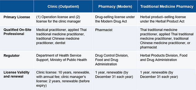 If the government ends dispensaries outright and forces a conversion to clinics or pharmacies, compensation will not be automatic at the outset. As a result, business operators should plan for compliance and repurposing under the Medical Facilities Act, Modern Drug Act, and Herbal Product Act, which regulate medical clinics, modern pharmacies, and traditional medicine pharmacies, respectively. The table below summarizes the required licenses for clinics, pharmacies, and traditional medicine pharmacies selling cannabis flowers in Thailand. Aside from the specific listed licenses, all three types of establishments must also obtain a license to sell a controlled herb (cannabis flowers) from the Department of Thai Traditional and Alternative Medicine. This license is valid for three years and is renewable.