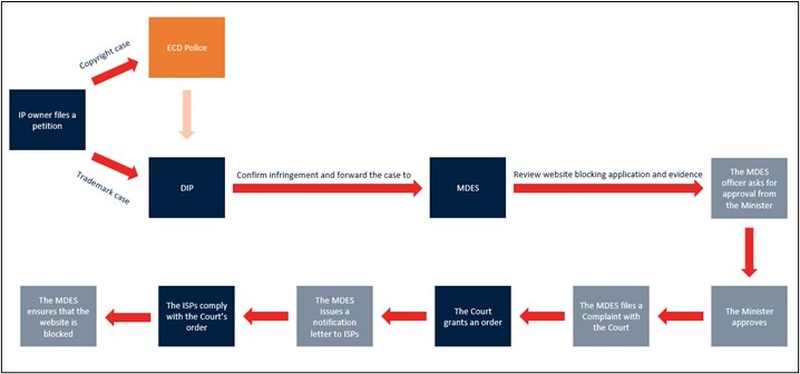 The DIP reviews the evidence and, if infringement is confirmed, forwards it to the MDES for further consideration. If the case is deemed valid, the MDES requests a court order to block the infringing website. Once granted, the MDES notifies the internet service providers (ISPs) to block access to the specified website.
